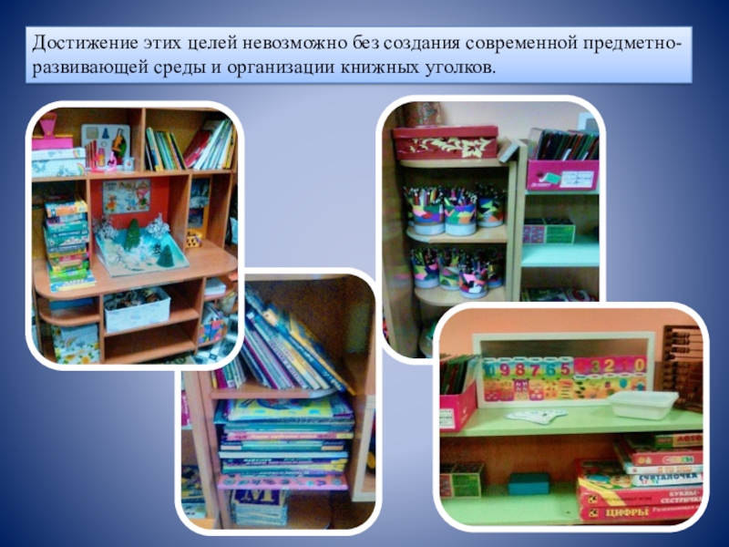 Слайд 8Достижение этих целей невозможно без создания современной предметно-развивающей среды и организации