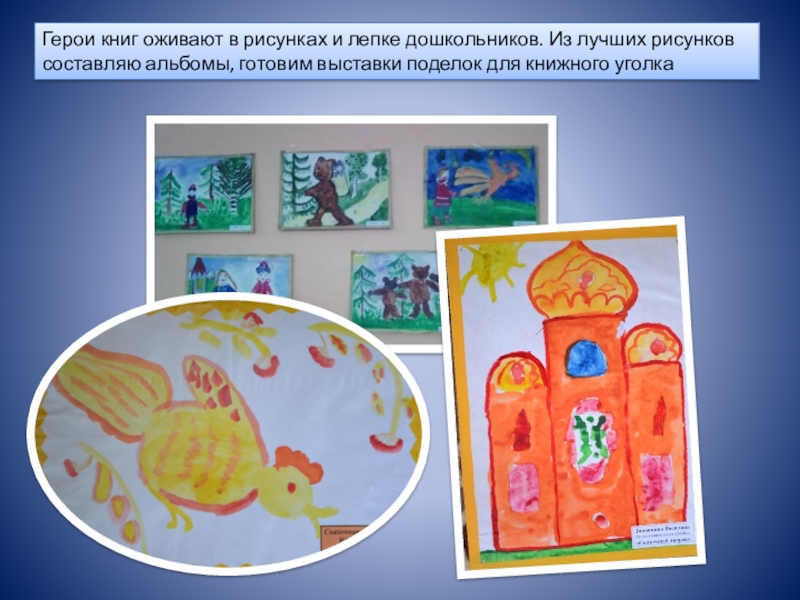 Слайд 17Герои книг оживают в рисунках и лепке дошкольников. Из лучших рисунков
