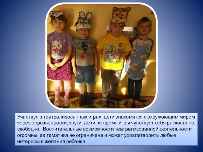 Слайд 23Участвуя в театрализованных играх, дети знакомятся с окружающим миром через образы,
