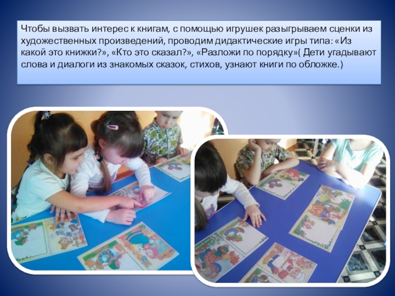 Слайд 15Чтобы вызвать интерес к книгам, с помощью игрушек разыгрываем сценки из