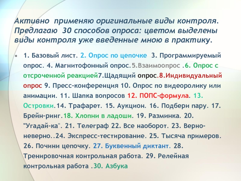 1. Базовый лист. 2. Опрос по цепочке 3. Программируемый опрос. 4. Магнитофонный опрос.5.Взаимоопрос .6. Опрос с отсроченной реакцией7.Щадящий опрос.8.Индивидуальный опрос 9. Пресс-конференция 10. Опрос по видеоролику или анимации. 11. Шапка вопросов 12. ПОПС-формула. 13. Островки.14. Трафарет. 15. Аукцион. 16. Подбери пару. 17. Брейн-ринг.18. Хлопни в ладоши. 19. Разминка. 20. "Угадай-ка". 21. Телеграф 22. Все наоборот. 23. Верно-неверно..24. Экспресс-тестирование. 25. Тысяча примеров. 26. Почини цепочку. 27. Буквенный диктант. 28. Тренировочная контрольная работа. 29. Релейная контрольная работа .30. Азбука