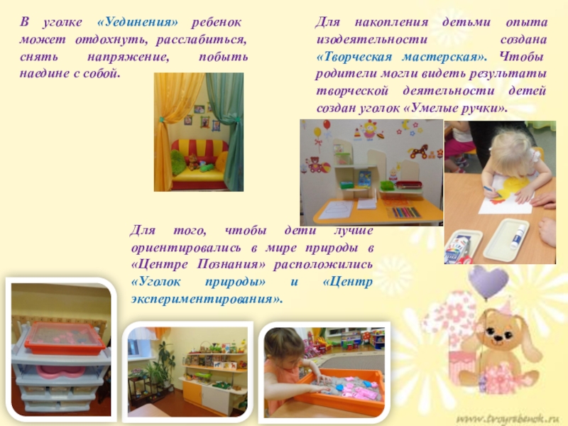 В уголке «Уединения» ребенок может отдохнуть, расслабиться, снять напряжение, побыть наедине с собой.
