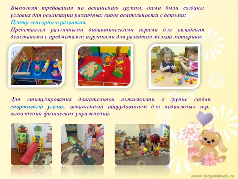 Для стимулирования двигательной активности в группе создан спортивный уголок, оснащенный оборудованием для подвижных игр, выполнения физических упражнений.