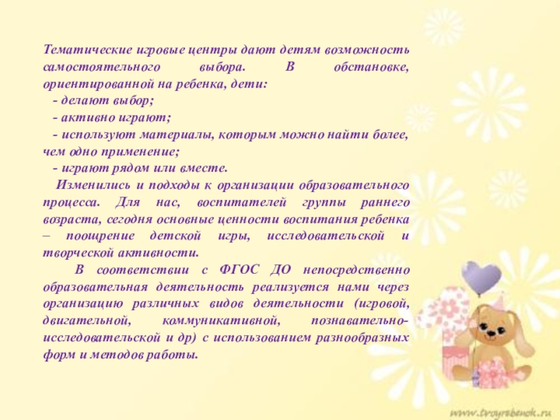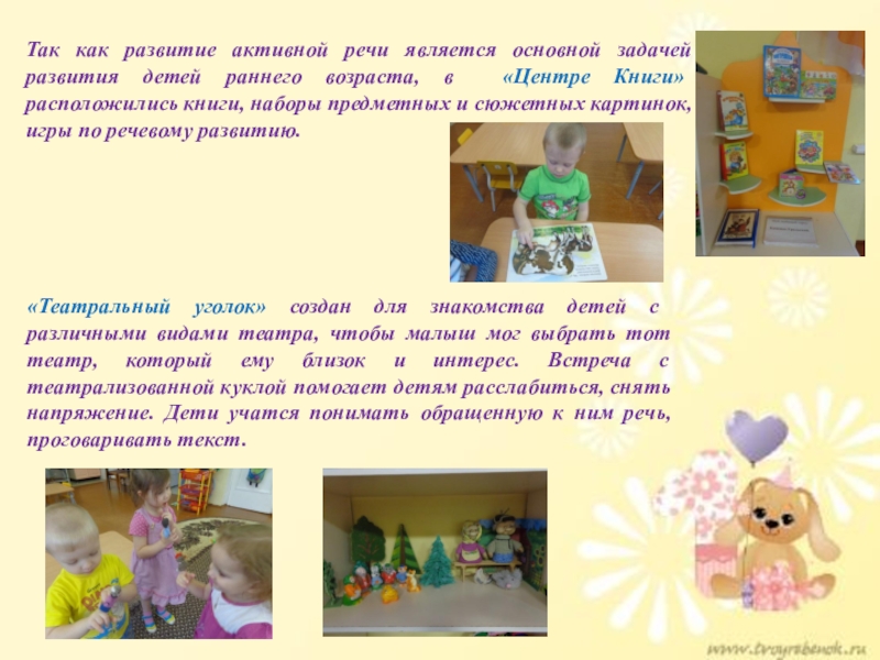 «Театральный уголок» создан для знакомства детей с различными видами театра, чтобы малыш мог выбрать тот театр, который ему близок и интерес. Встреча с театрализованной куклой помогает детям расслабиться, снять напряжение. Дети учатся понимать обращенную к ним речь, проговаривать текст.