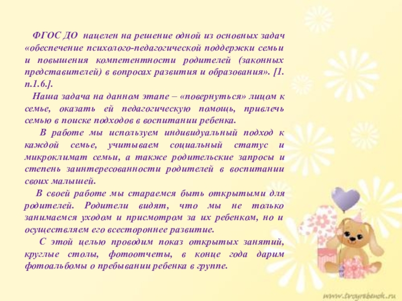 Индивидуальный подход необходим не только в работе с детьми, но и в работе с родителями. Общаясь с родителями, мы стараемся чувствовать ситуацию, настроение мамы или папы.