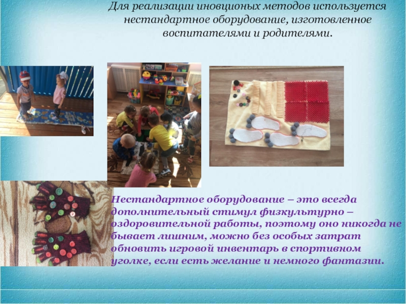 Нестандартное оборудование – это всегда дополнительный стимул физкультурно –оздоровительной работы, поэтому оно никогда не бывает лишним, можно без особых затрат обновить игровой инвентарь в спортивном уголке, если есть желание и немного фантазии.
