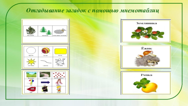 Слайд 18Отгадывание загадок с помощью мнемотаблиц