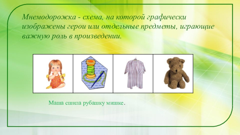 Слайд 9Мнемодорожка - схема, на которой графически изображены герои или отдельные предметы,