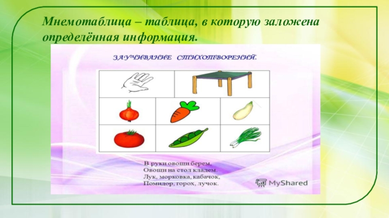 Слайд 12Мнемотаблица – таблица, в которую заложена определённая информация.