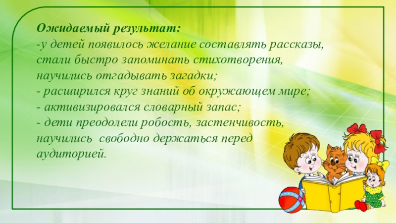 - дети преодолели робость, застенчивость, научились свободно держаться перед аудиторией.