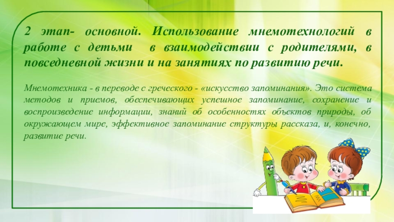 Слайд 82 этап- основной. Использование мнемотехнологий в работе с детьми в взаимодействии