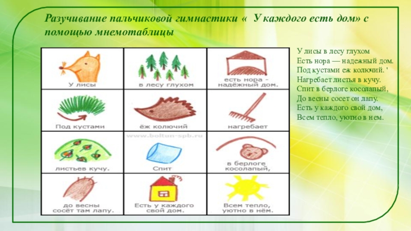 Слайд 16Разучивание пальчиковой гимнастики « У каждого есть дом» с помощью мнемотаблицы