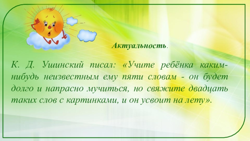 К. Д. Ушинский писал: «Учите ребёнка каким-нибудь неизвестным ему пяти словам - он будет долго и напрасно мучиться, но свяжите двадцать таких слов с картинками, и он усвоит на лету».