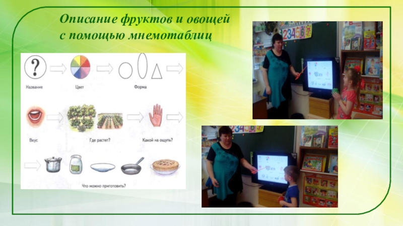 Слайд 23Описание фруктов и овощей с помощью мнемотаблиц