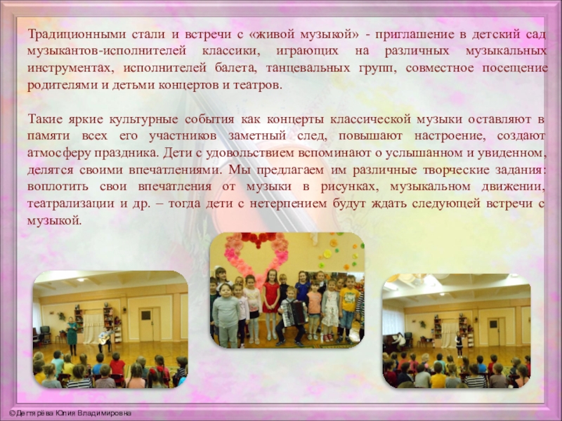 Слайд 19Традиционными стали и встречи с «живой музыкой» - приглашение в детский
