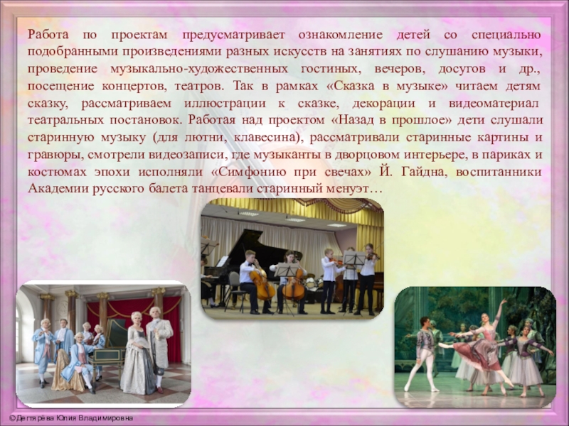 искусств на занятиях по слушанию музыки, проведение музыкально-художественных гостиных, вечеров, досугов и др., посещение концертов, театров. Так в рамках «Сказка в музыке» читаем детям сказку, рассматриваем иллюстрации к сказке, декорации и видеоматериал театральных постановок. Работая над проектом «Назад в прошлое» дети слушали старинную музыку (для лютни, клавесина), рассматривали старинные картины и гравюры, смотрели видеозаписи, где музыканты в дворцовом интерьере, в париках и костюмах эпохи исполняли «Симфонию при свечах» Й. Гайдна, воспитанники Академии русского балета танцевали старинный менуэт…