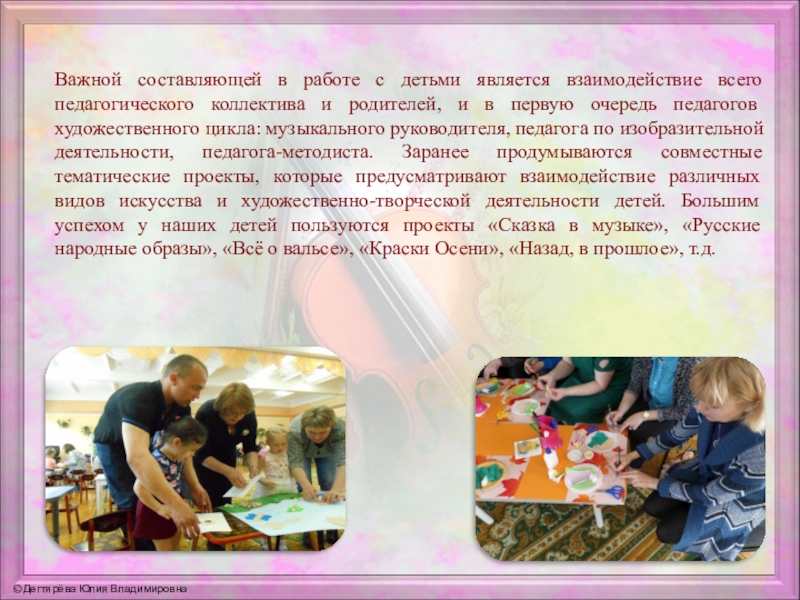 и родителей, и в первую очередь педагогов художественного цикла: музыкального руководителя, педагога по изобразительной деятельности, педагога-методиста. Заранее продумываются совместные тематические проекты, которые предусматривают взаимодействие различных видов искусства и художественно-творческой деятельности детей. Большим успехом у наших детей пользуются проекты «Сказка в музыке», «Русские народные образы», «Всё о вальсе», «Краски Осени», «Назад, в прошлое», т.д.