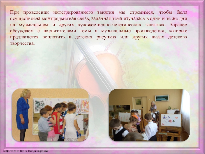 заданная тема изучалась в одни и те же дни на музыкальном и других художественно-эстетических занятиях. Заранее обсуждаем с воспитателями темы и музыкальные произведения, которые предлагается воплотить в детских рисунках или других видах детского творчества.