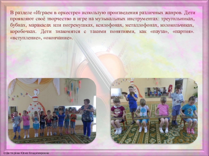 своё творчество в игре на музыкальных инструментах: треугольниках, бубнах, маракасах или погремушках, ксилофонах, металлофонах, колокольчиках, коробочках. Дети знакомятся с такими понятиями, как «пауза», «партия». «вступление», «окончание».