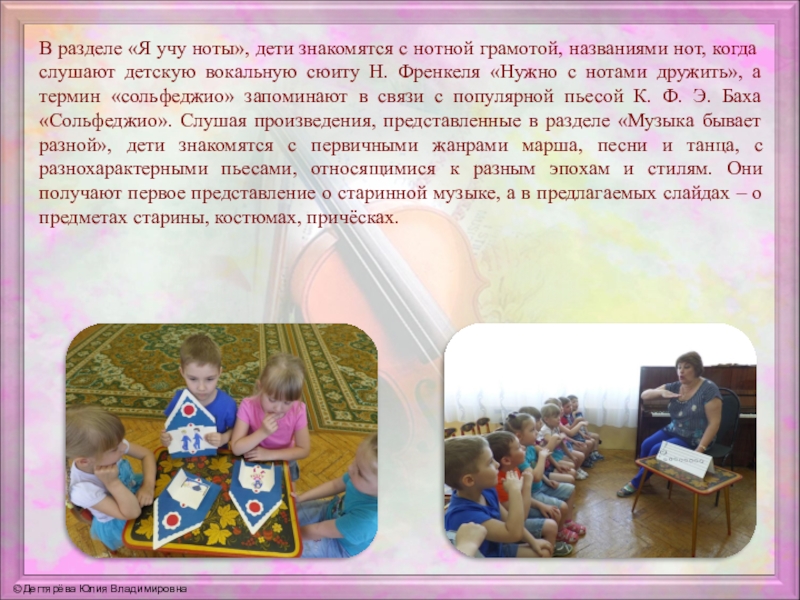 нот, когда слушают детскую вокальную сюиту Н. Френкеля «Нужно с нотами дружить», а термин «сольфеджио» запоминают в связи с популярной пьесой К. Ф. Э. Баха «Сольфеджио». Слушая произведения, представленные в разделе «Музыка бывает разной», дети знакомятся с первичными жанрами марша, песни и танца, с разнохарактерными пьесами, относящимися к разным эпохам и стилям. Они получают первое представление о старинной музыке, а в предлагаемых слайдах – о предметах старины, костюмах, причёсках.
