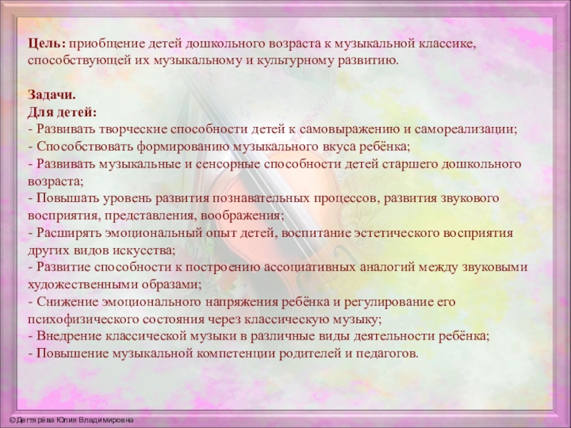 Слайд 3Цель: приобщение детей дошкольного возраста к музыкальной классике, способствующей их музыкальному
