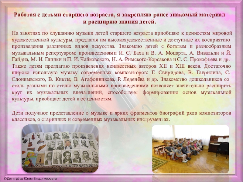 На занятиях по слушанию музыки детей старшего возраста приобщаю к ценностям мировой художественной культуры, предлагая им высокохудожественные и доступные их восприятию произведения различных видов искусства. Знакомлю детей с богатым и разнообразным музыкальным репертуаром: произведениями И. С. Баха и В. А. Моцарта, А. Вивальди и Й. Гайдна, М. И. Глинки и П. И. Чайковского, Н. А. Римского-Корсакова и С. С. Прокофьева и др. Также детям предлагаю произведения неизвестных авторов XII и XIII веков. Достаточно широко использую музыку современных композиторов: Г. Свиридова, В. Гаврилина, С. Слонимвского, В. Кикты, В. Агафонникова, Р. Леденёва и др. Знакомство дошкольников со столь разными по стилю музыкальными произведениями позволяет значительно расширить круг их музыкальных впечатлений, способствует формированию основ музыкальной культуры, приобщает детей к её ценностям.