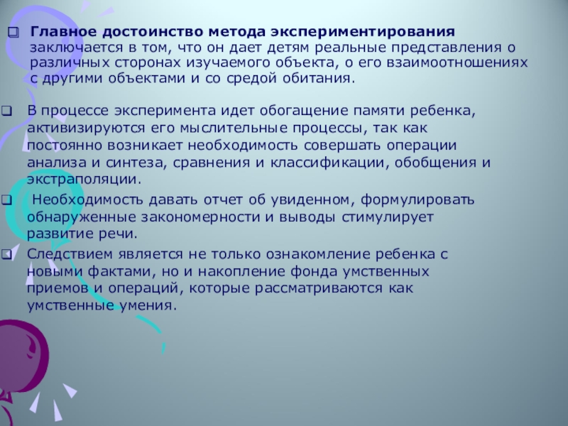 В процессе эксперимента идет обогащение памяти ребенка, активизируются его мыслительные процессы, так как постоянно возникает необходимость совершать операции анализа и синтеза, сравнения и классификации, обобщения и экстраполяции.