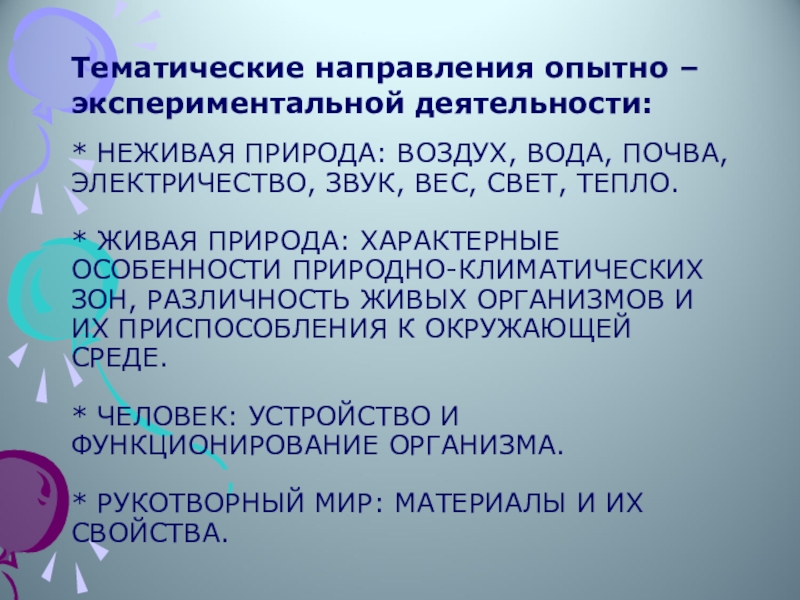 Тематические направления опытно – экспериментальной деятельности:
