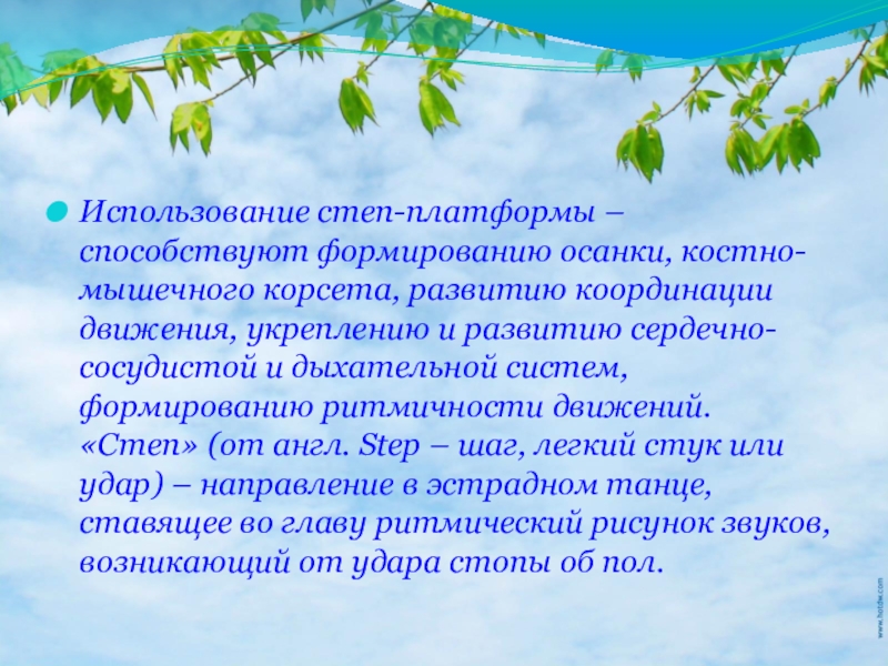 укреплению и развитию сердечно-сосудистой и дыхательной систем, формированию ритмичности движений. «Степ» (от англ. Step – шаг, легкий стук или удар) – направление в эстрадном танце, ставящее во главу ритмический рисунок звуков, возникающий от удара стопы об пол.