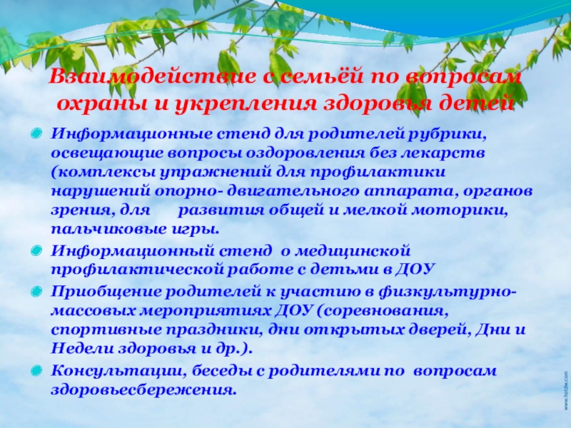 Слайд 31Взаимодействие с семьёй по вопросам охраны и укрепления здоровья детей