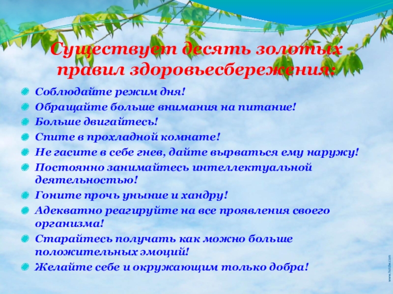 Слайд 32Существует десять золотых правил здоровьесбережения: