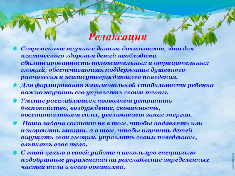Умение расслабляться позволяет устранить беспокойство, возбуждение, скованность, восстанавливает силы, увеличивает запас энергии.