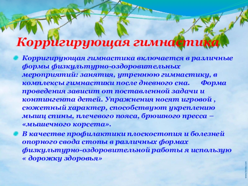Корригирующая гимнастика включается в различные формы физкультурно-оздоровительных мероприятий: