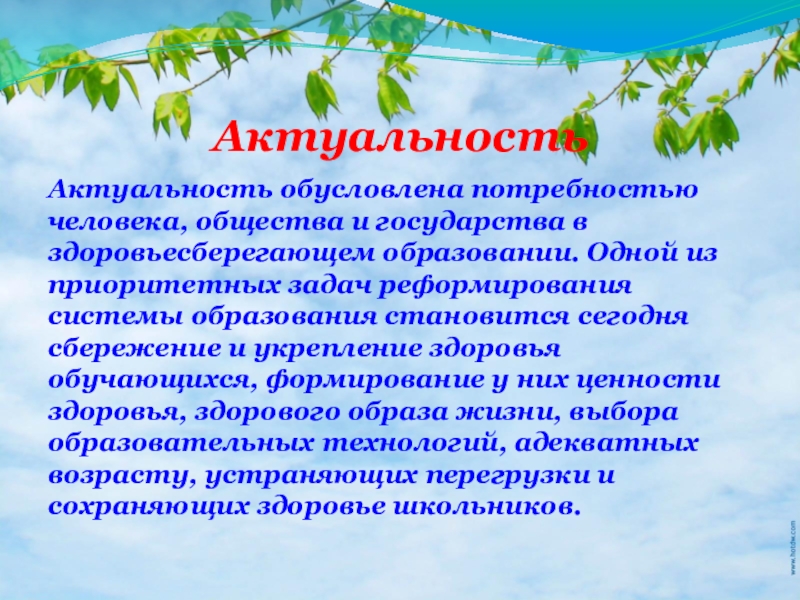 Актуальность обусловлена потребностью человека, общества и государства в здоровьесберегающем образовании.