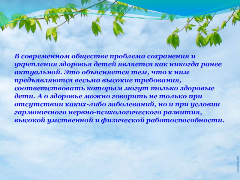 никогда ранее актуальной. Это объясняется тем, что к ним предъявляются весьма высокие требования, соответствовать которым могут только здоровые дети. А о здоровье можно говорить не только при отсутствии каких-либо заболеваний, но и при условии гармоничного нервно-психологического развития, высокой умственной и физической работоспособности.