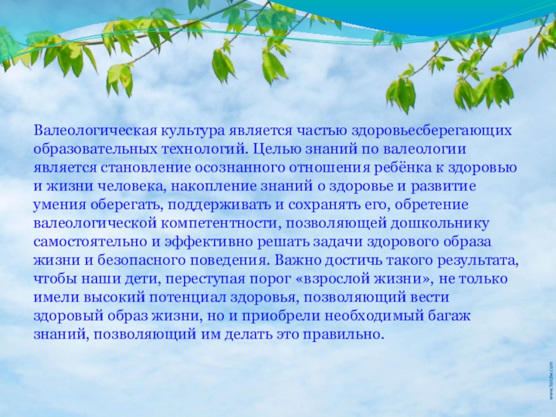 Валеологическая культура является частью здоровьесберегающих образовательных технологий. Целью знаний по валеологии