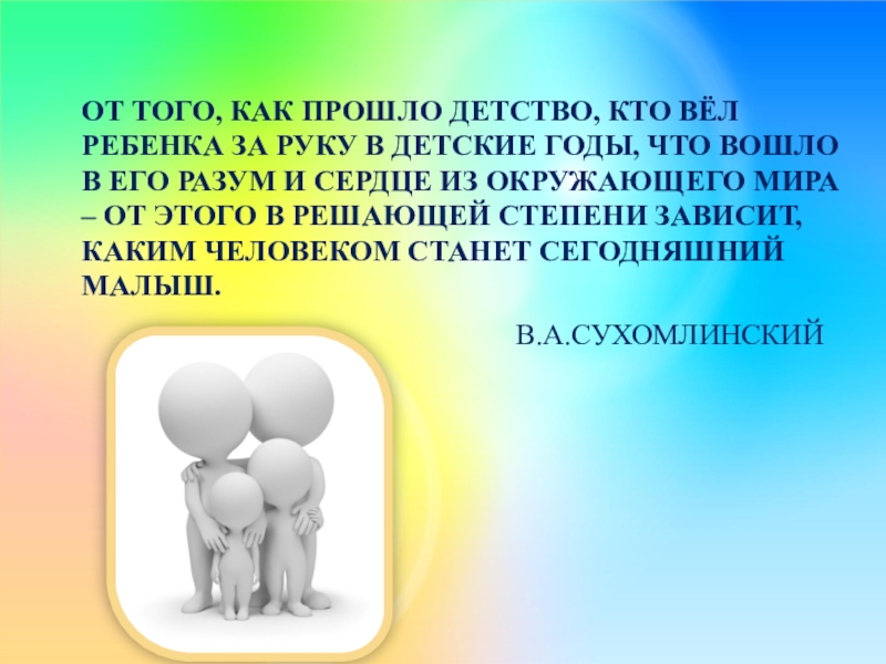 ОТ ТОГО, КАК ПРОШЛО ДЕТСТВО, КТО ВЁЛ РЕБЕНКА ЗА РУКУ В ДЕТСКИЕ ГОДЫ, ЧТО ВОШЛО В ЕГО РАЗУМ И СЕРДЦЕ ИЗ ОКРУЖАЮЩЕГО МИРА – ОТ ЭТОГО В РЕШАЮЩЕЙ СТЕПЕНИ ЗАВИСИТ, КАКИМ ЧЕЛОВЕКОМ СТАНЕТ СЕГОДНЯШНИЙ МАЛЫШ.