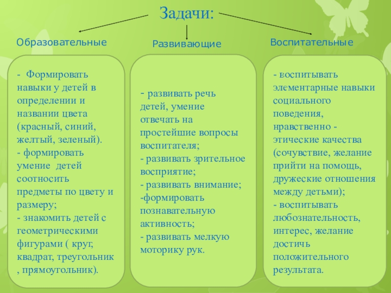 - воспитывать элементарные навыки социального поведения, нравственно - этические качества (сочувствие, желание прийти на помощь, дружеские отношения между детьми);