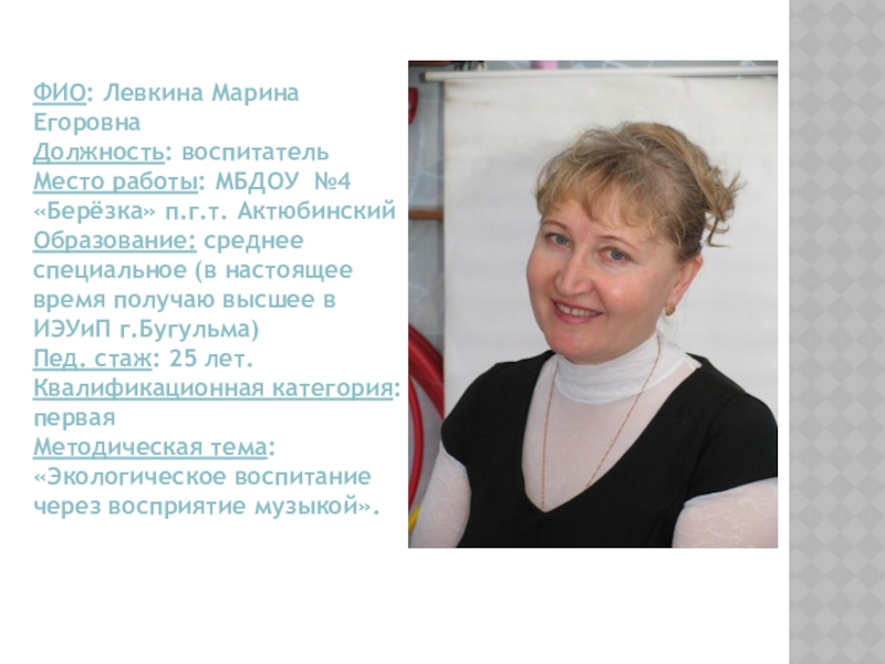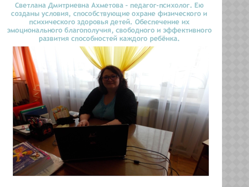 Слайд 25Светлана Дмитриевна Ахметова – педагог-психолог. Ею созданы условия, способствующие охране физического