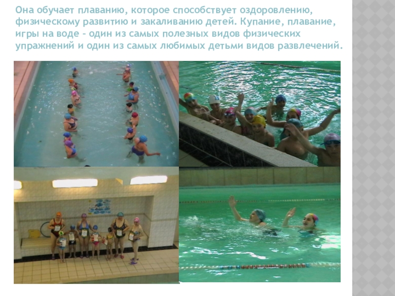 Слайд 16Она обучает плаванию, которое способствует оздоровлению, физическому развитию и закаливанию детей.