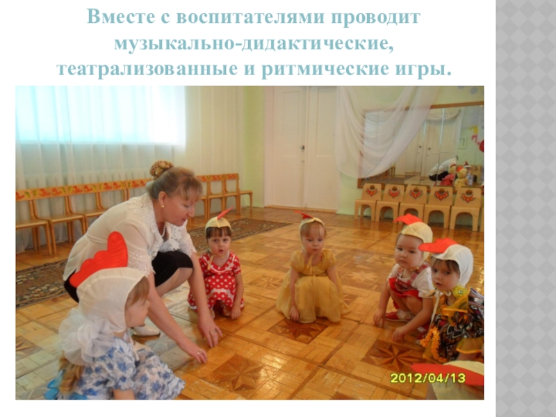 Слайд 8Вместе с воспитателями проводит музыкально-дидактические, театрализованные и ритмические игры.