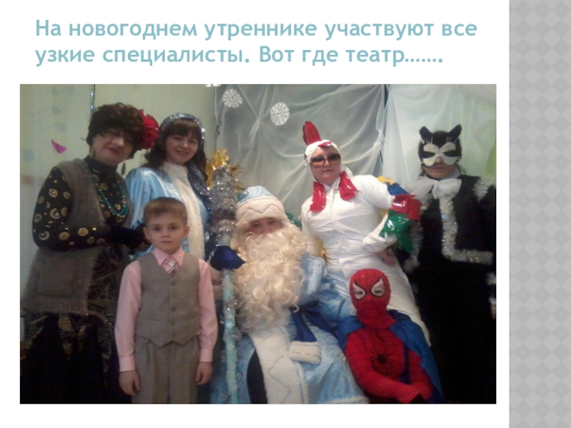 Слайд 10На новогоднем утреннике участвуют все узкие специалисты. Вот где театр…….