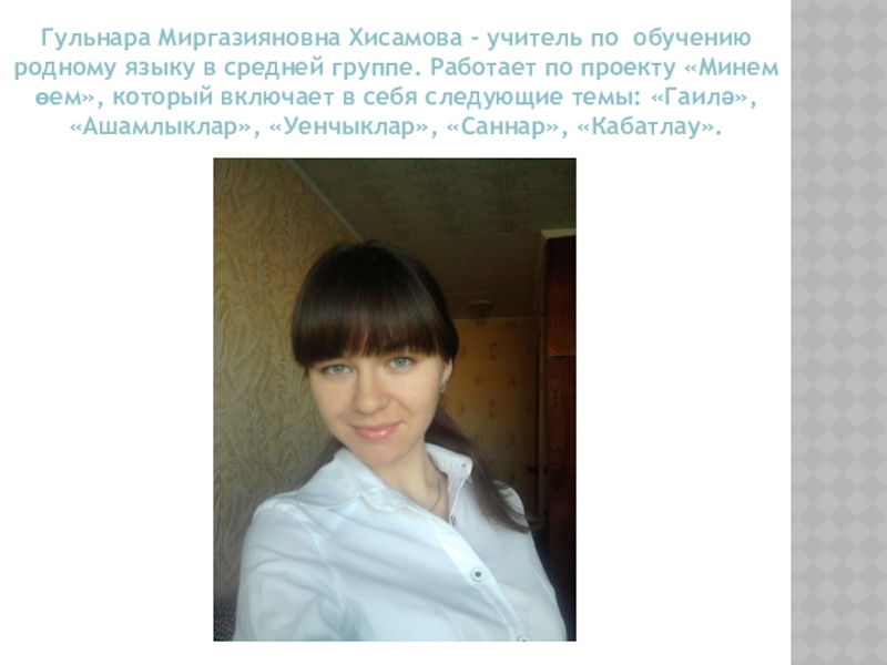 Слайд 20Гульнара Миргазияновна Хисамова - учитель по обучению родному языку в средней группе.