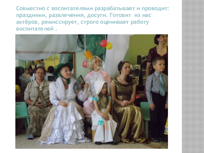 Слайд 9Совместно с воспитателями разрабатывает и проводит: праздники, развлечения, досуги. Готовит из