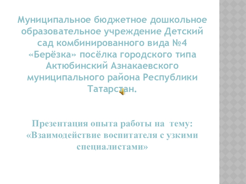 Презентация опыта работы на тему: «Взаимодействие воспитателя с узкими специалистами»