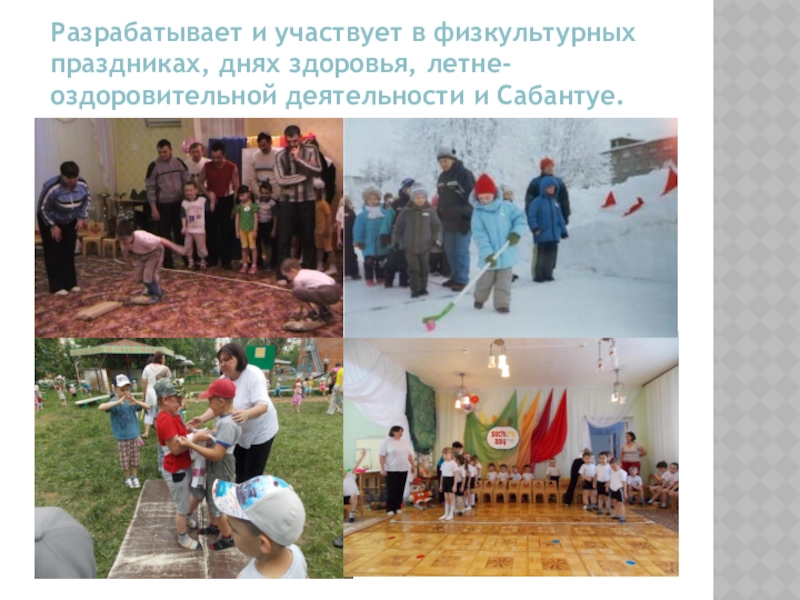 Разрабатывает и участвует в физкультурных праздниках, днях здоровья, летне-оздоровительной деятельности и