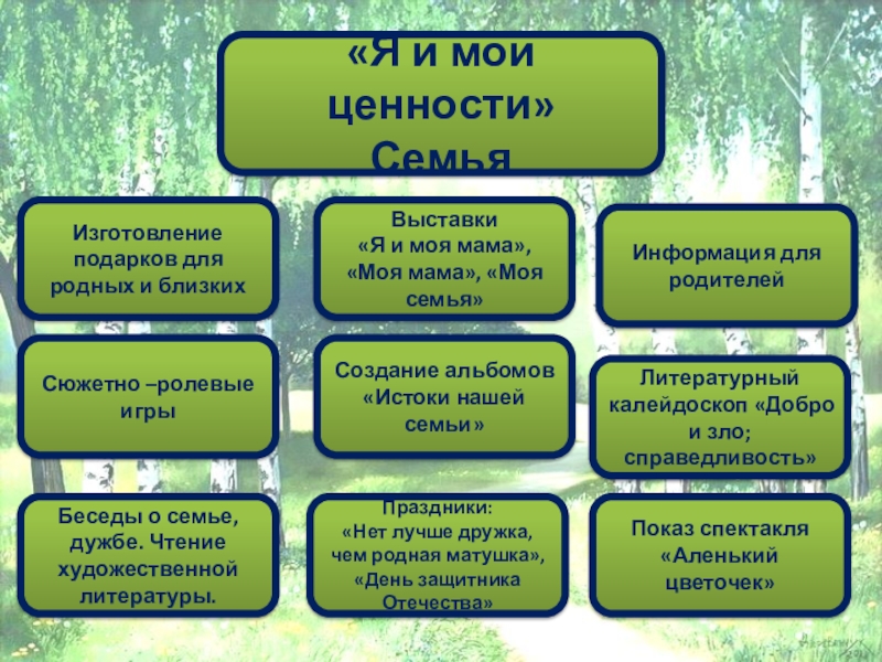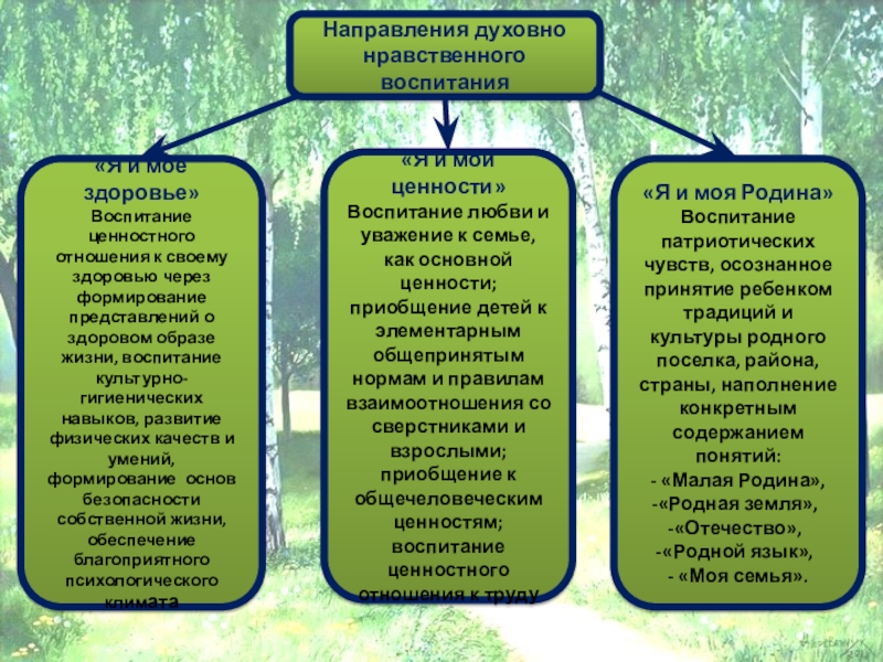 Воспитание любви и уважение к семье, как основной ценности; приобщение детей к элементарным общепринятым нормам и правилам взаимоотношения со сверстниками и взрослыми; приобщение к общечеловеческим ценностям; воспитание ценностного отношения к труду