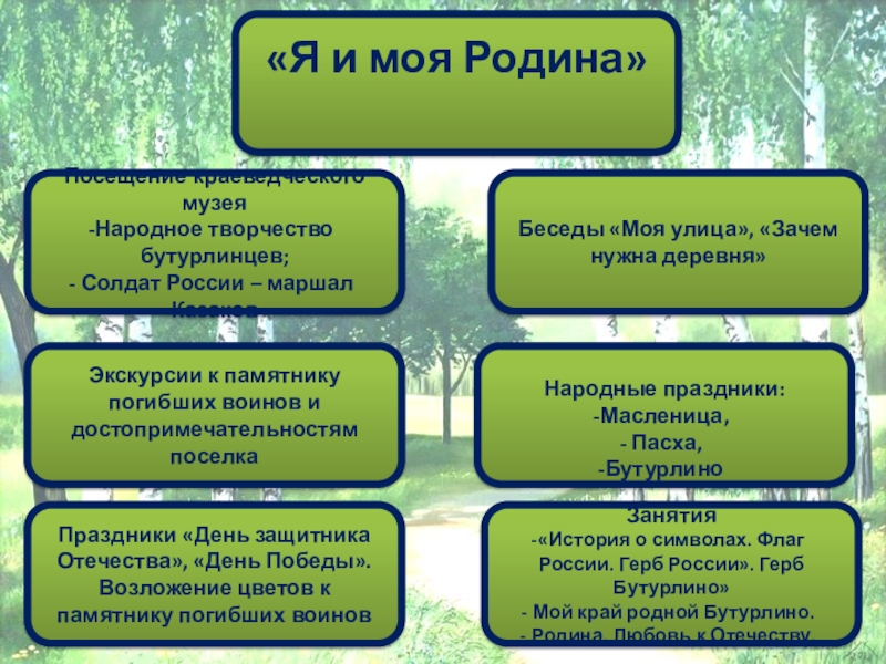 Воспитание патриотических чувств, осознанное принятие ребенком традиций и культуры родного поселка, района, страны, наполнение конкретным содержанием понятий: