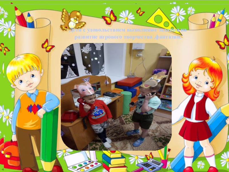 Слайд 11Дети с удовольствием выполняют задания на развитие игрового творчества ,фантазии.