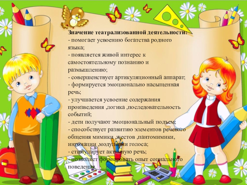 - способствует развитию элементов речевого общения мимики ,жестов ,пантомимики, интонации ,модуляции голоса;